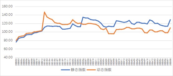 2025年1-8月,白酒指数ZJZS-B/CADI-BJ静态指数JS:122.19点,环比提高18.46点;动态指数DD:108.08点,环比提高13.39点。